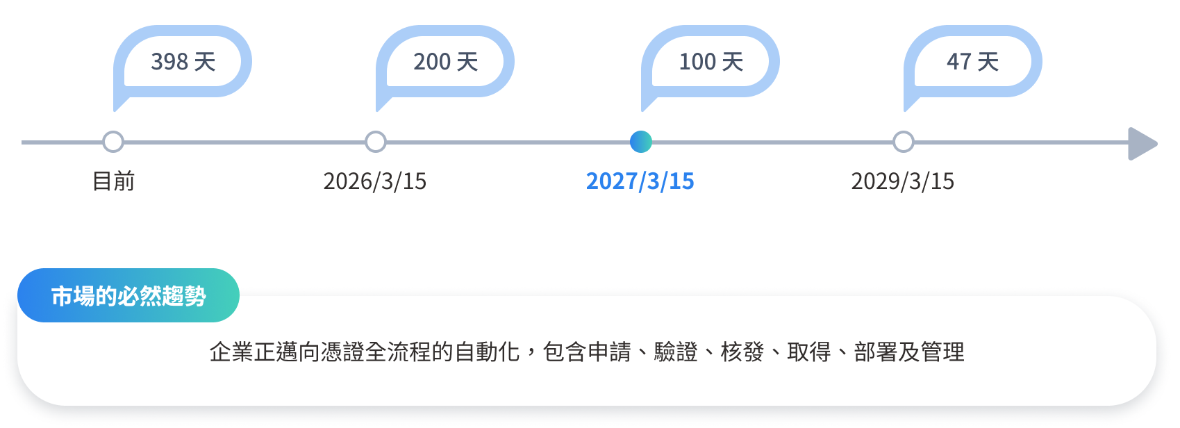 未來各憑證發行單位(CA)將依 CA/B Forum 決議逐步縮短 SSL 憑證的有效期限,期程如下: